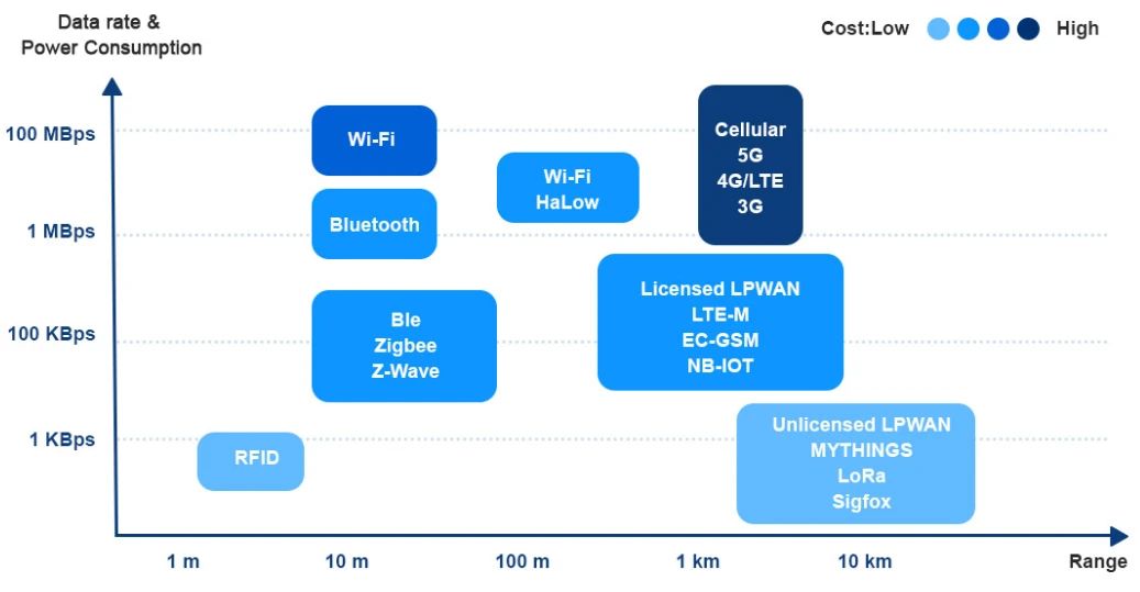 图1.典型无线通信设备传输速率和传输距离总览(from MOKO SMART)