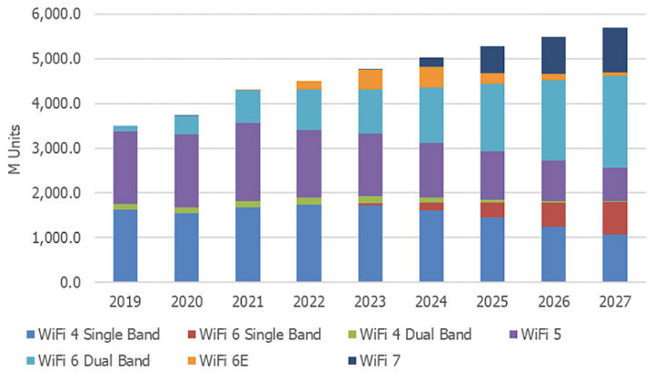 图2.WiFi设备的历史出货量及预测(from IoT business news)