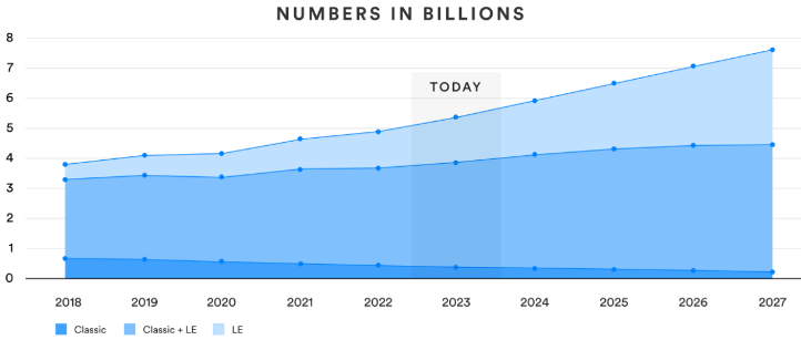 图3.蓝牙设备的历史出货量及预测(from Bluetooth SIG)