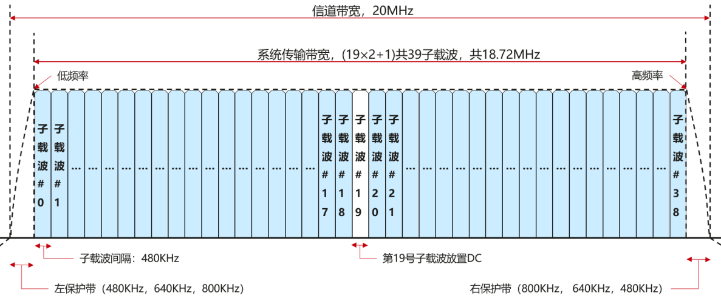 SLB采用循环前缀正交频分复用(CP-OFDM)波形传输。CP-OFDM系统使用多个正交子载波并行传输数据,可以高效传输数据并且有效对抗信道频率选择性衰落带来的影响。(信道频率选择性衰落是指传输信道对信号不同的频率成分有不同的随机响应,信号中不同频率分量衰落不一致,引起信号波形失真。)但是在数据传输过程中,CP-OFDM对子载波的正交性有严苛的要求,所以对载波及采样时钟的频偏非常敏感。CP-OFDM符号在时域上包含循环前缀和有效数据,有效数据的长度为64Ts,其中Ts是物理层的基本时间单位,Ts=1/fs,fs=30.72MHz,Ts=0.03255μs。循环前缀的长度通常是根据信道的时延确定的。当循环前缀的长度大于信道时延的最大值,可以确保接收端接收到的符号不会与前一个发送重叠,因此抵消信道引起的多径效应,避免符号间的干扰。循环前缀有常规型和扩展型,分别处理不同传输距离应用;常规型长度为5Ts=0.163μs,扩展型长度为14Ts=0.456μs。数值上相近于5G的0.146/0.52μs,低于WiFi6的0.8/1.6/3.2μs。通常认为,较短的循环前缀长度对应较短通信距离应用场景。星闪SLB载波带宽最小为20MHz向上支持规格40/60/80/100/160/320MHz的载波带宽,分别由连续多个20MHz的载波聚合方式组成。更大的载波带宽通常代表更大数据吞吐量。20MHz载波由连续39个子载波组成,如图5所示,子载波间隔480kHz,按照对应频率从低到高的顺序依次编号为#0#1…#38,其中#19子载波为直流子载波,不承载信息。在一个20MHz工作带宽中,最低频率和最高频率各预留部分资源不放置可用子载波。