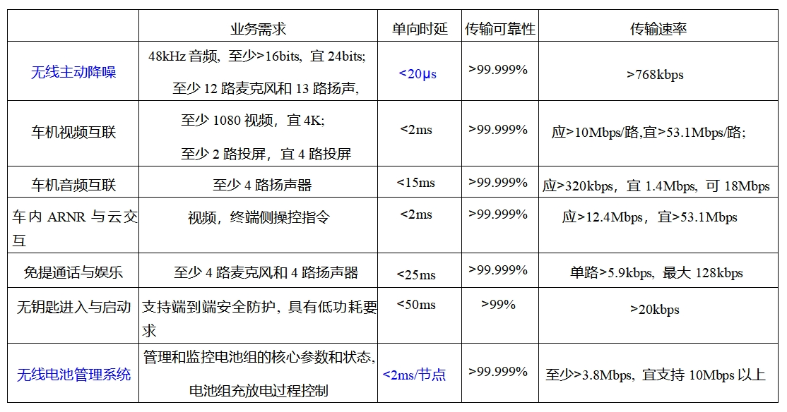 具体的通信要求见表1。下面我们去做现有方案和星闪方案的对比。1)车内主动降噪现有方案为有线连接方案,其重量和成本相对无线有劣势。有线主动降噪目前的汽车产品渗透率为7%,主要分布在15万元以上的中高端车。由于其微秒级的时延需求,当前的WiFi不能满足,因此不属于存量市场。2)无线车钥匙现有方案为射频或蓝牙BLE方案,前者不能与其他终端互联,后者定位精度只有米级。星闪可以连接智能终端、定位精度在分米级。目前无线车钥匙的渗透率接近100%。3)电池管理系统现有方案主要为控制器区域网络有线通信方案,其生态成熟但使用线束长、接线器多、功耗大、成本高、传输可靠性差。同样由于其对时延的要求,当前的WiFi很难满足,因此有星闪应用潜力。4)列表中其余应用的现有方案存在WiFi和蓝牙BLE的既有技术,属于存量市场,但星闪有更低时延和更高并发优势。