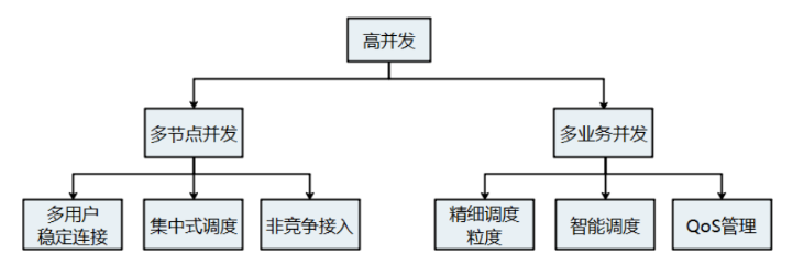 a.多节点并发 多节点并发是指单个G节点可以同时支持与多个T节点的连接,支持单个G节点同时为多个T节点提供服务。多业务并发是指对于单个T节点,支持单个T节点上同时存在多种不同类型的业务,以便为用户提供丰富的业务体验。星闪SLB理论上单个G节点可最多支持4096个T节点。星闪SLB采用集中式调度,避免了大量节点分布式资源抢占带来的链路冲突,提高了系统吞吐量。星闪系统也支持非竞争接入方式,即可支持大量T节点在相互正交的资源上同时发起群接入,可实现毫秒量级接入,可满足“上电即工作”的场景下的服务需求。b.多业务并发 基于业务特征的智能调度。星闪系统允许T节点进行必要的业务特征信息上报,辅助G节点进行智能调度。对于主动降噪业务,G节点支持T节点上报采样率和量化位宽;对于半静态调度业务,T节点可以向G节点报告半静态调度周期和数据包大小,便于G节点进行灵活调度。在调度上,星闪系统支持逻辑信道优先级机制,按照逻辑信道优先级进行数据封装。同时,系统又允许适当约束不同优先级业务的数据封装量,兼顾不同业务调度的公平性。a.多节点时域同步 星闪系统通过多G节点间时间/频率同步降低多域间的干扰。星闪系统采用OFDM波形,存在多个通信域的场景下,即使不同的通信域使用不同的频点,如果频率差不是子载波间隔SCS=480KHz的整数倍或者定时差异超过CP,则会造成子载波间的干扰。特别的,在干扰来自多个通信域的情况,以及干扰源比信号源距离接收设备近得多的情况,G节点之间的时频不对齐引入的干扰会显著降低接收信干噪比。多G节点间时/频同步可以显著降低多域间的干扰,提升多域共存时的频谱效率。星闪系统需要考虑多个通信域处于相同物理空间的情况。在密集部署场景中,干扰源到接收机的路径损耗甚至可能明显小于信号源到接收机的路径损耗。以两个使用相邻载波的通信域为例,考虑两个域G节点发射功率相同,来自其它域的干扰源到接收机的路径损耗比信号源到接收机的路径损耗例如小20dB。当两个域同步时,频率同步误差例如为100Hz,则干扰源泄露到本载波的功率相对于干扰源的功率小于-74dB,接收信干比高于54dB,干扰可以忽略。当两个域异步时,一般只能依靠滤波器抑制邻频干扰,干扰源泄露到本载波的功率相对于干扰源的功率约20dB,接收信干比约0dB。不难看出,多G节点间时/频同步可以显著降低通信域之间的干扰,特别是位于相邻载波的通信域之间的干扰。多域多G节点间时/频同步可通过G节点发送多G节点同步信息和G节点侦听行为完成。b.多通信域资源协调 星闪SLB支持高级通信域的G节点通过广播为其它通信域分配资源池,以实现多域资源协调。不同通信域的资源池可以使用不同的载波,在相同载波上的不同通信域的资源池可以使用不同的符号。在每个包含高级通信域的载波上,高级通信域的G节点通过系统消息指示不同的通信域使用时域正交的资源池,避免不同通信域的通信链路使用相同的资源。