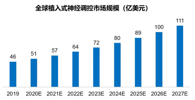 在医疗器械行业,神经调控已经成为发展最快的一个领域。美国FDA批准的新型神经调控设备也在逐年增长。在治疗偏头痛、肥胖、抑郁和强迫症等疾病方面,神经调控技术将成为研究和治疗的新方向。神经调控设备国产化是神经调控事业在我国快速发展的标志以及未来最显著的趋势。世界神经调控器械市场主要被美国的Medtronic,Abbott,Boston Scientific等公司垄断,我国目前在该领域处于快速发展及超越阶段。2009年,我国完成第一项国产DBS临床试验,至今已经完成1万多例次,市场占有率超过60%。2014年,国产的迷走神经刺激进行临床试验,现在国内的临床占有率超过了70%。骶神经刺激已完成动物实验,进入了临床试验阶段,脊髓电刺激也将在近两年内进入临床试验阶段。根据公开资料显示,2019年全球植入式神经调控终端市场规模为46亿美元,2020年全球市场规模已达58亿美元,且发展迅速。我国市场现阶段仅占全球的2%。随着癫痫、帕金森、疼痛等各类慢性疾病发病率的增加和神经外科微创手术的进步,2020-2027年市场复合增长率有望达到11.7%,预计2027年市场规模将达到110亿美元。