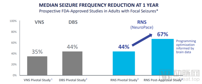 图:反馈式神经电刺激设备示意图一项RNS治疗难治性癫痫的9年随访研究结果显示:73%的患者发作至少减少50%,35%的患者癫痫发作减少了90%以上,28%的患者无发作时间大于6个月[2]。其他研究表明,颞叶内侧癫痫、术前评估为1-2个病灶、接受过手术或植入迷走神经刺激器(VNS)的患者对RNS的反应性更好。另外,一些前期的研究显示RNS收集的ECoG可作为医生为患者选择合适的抗癫痫药参考。
