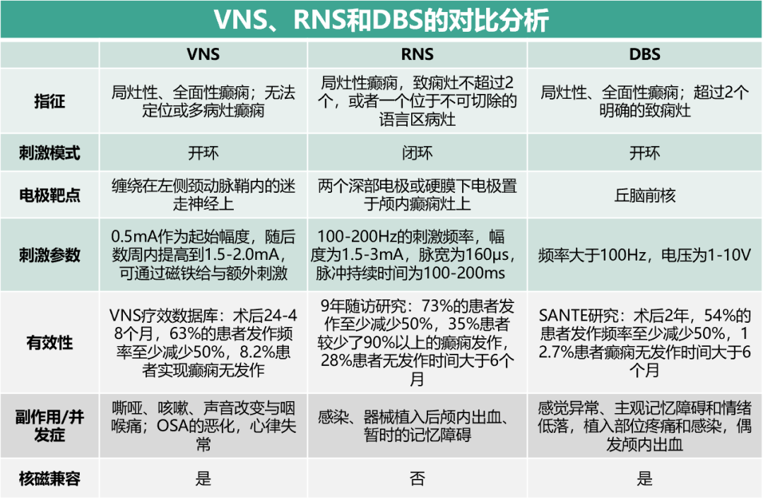 神经调控技术对于药物难治性癫痫的治疗在临床应用越来越广泛。目前,全球范围内已经获批用于癫痫治疗的神经调控技术包括迷走神经刺激(VNS)、反应性神经刺激(RNS)和脑深部刺激(DBS)。2021年7月发表于《Aging and Disease》的文章,基于现有临床研究,对VNS、RNS和DBS的有效性和安全性进行了相关总结。下表是三种技术的对比分析: