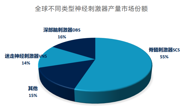 数据来源:公开信息当前,神经科学已成为各国重点发展的学科,积极的政策更是推动了新型神经调控技术科研及应用转化的加速。相较于全球,国内神经调控市场仍处于起步阶段,未来存在巨大的发展机会。美国是全球最大的神经调控市场,占据超过1/3的市场份额。先进的神经调控医疗技术、发达的医疗保障体系和高水平的人均收入是美国市场背后的助推因素。SCS是全球最大的神经调控市场,其次为DBS。美敦力、雅培、波士顿科学是神经调节市场的三大巨头,主要参与者还有:LivaNova、Nuvectra、Nevro、NeuroSigma、NeuroPace、Neuronetics等。其中,美敦力、雅培、波士顿科学、LivaNova、Nevro、Nuvectra、NeuroPace七大参与者的神经调节产品占据了全球绝大部分市场份额,是脊髓刺激(SCS)、脑深部刺激(DBS)、迷走神经刺激(VNS)、骶神经刺激(SNS)前四大细分市场的领先者。关于植入式神经电刺激市场份额分布,脊髓刺激器(SCS)占比最多,2018年占总市场将近55%,深部脑刺激器占16%,迷走神经刺激器占14%,其他类占比约15%。