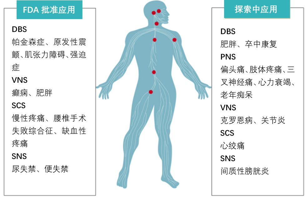 在脑功能性疾病给全球带来严重负担的背景下,借助于神经科学和生物医学工程技术的进步,神经调控成为当前医学发展最快的领域之一,其种类激增,适应症不断拓展,全球已有数十万脑功能性疾病患者从中获益。只要能够刺激到目标神经,人体的多个地方都可以应用神经调控技术——如植入在头部内的脑深部电刺激系统能够用来缓解帕金森病的震颤症状;植入在背部的脊髓刺激系统可以抑制顽固性后背疼痛;还有植入在骶椎附近的骶神经电刺激系统,它被用来治疗顽固型尿急尿频症。电刺激的应用主要有脊髓电刺激、脑深部电刺激、骶神经电刺激、迷走神经电刺激、人工耳蜗等等。