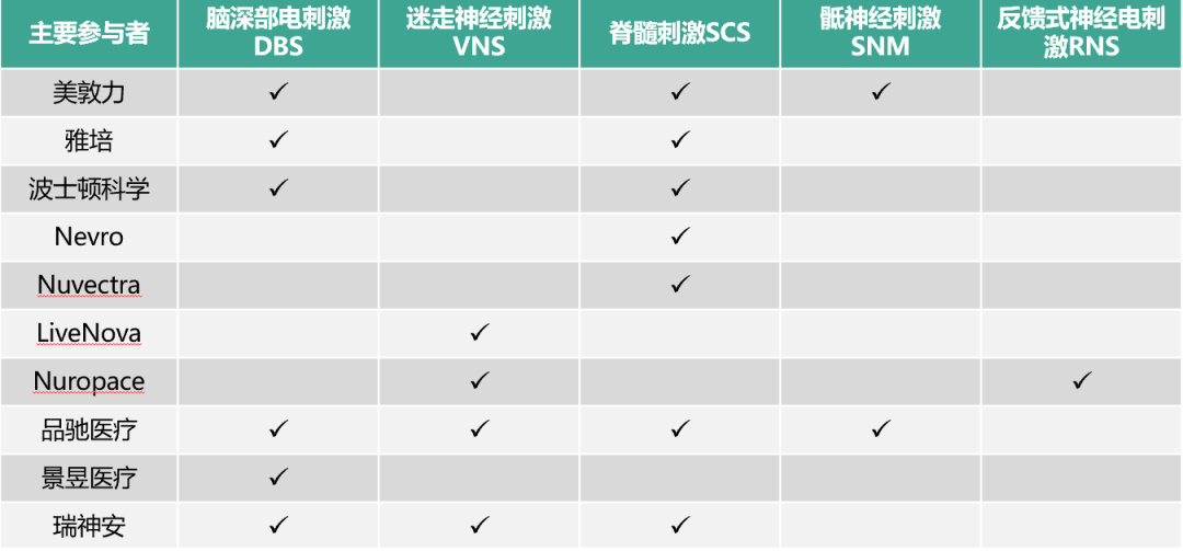 数据来源:公开信息目前,全球神经调节市场被美敦力、雅培、波士顿科学三大巨头占据了绝大部分市场份额,但也涌现出一批如Livanova、Nuropace等开创并引领神经调节新疗法的初创公司,在细分领域深耕出位。国内神经调控市场,品驰医疗占据绝对先发优势,甚至在某些细分领域的市场占有率超过美敦力等传统巨头,比如在国内DBS市场,品驰占65%,美敦力占35%。面对巨大的慢性疾病需求,神经调节领域还有巨大的增长空间,市场参与者们正不断研发新技术、推出新产品,扩大其适应症范围。